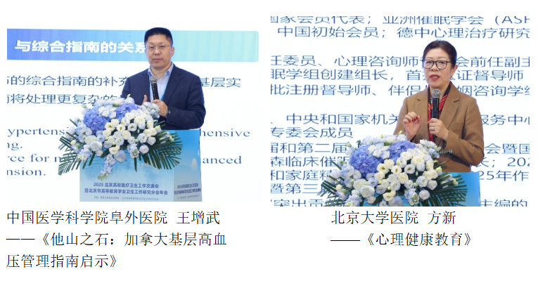 王增武会长介绍了国外目前高血压管理的整体状况;北京大学医院方新主任以“高校心理健康教育的实践与创新”为题,分享了心理健康教育工作的重要经验和有效做法;北京大学国际医院韩钢文主任深入讲解了“带状疱疹的预防及治疗”的最新进展;北京大学第一医院陈泽洋医生分析了“男性HPV感染风险及疾病负担”的研究成果;北京理工大学社区卫生服务中心张春丽探讨了“理论与变革——探索中国ASCVD患者联合降脂的理想选择”;北京大学第三医院范媛媛主任基于“中国15年临床实践”分享了宝贵经验;中科心桥(北京)心理医学研究院张海峰以“心脑交响:心理学遇见脑科学”为主题进行了精彩阐述;北京林业大学医院金安琴就“胃肠镜报告解读”进行了专业细致的讲解。