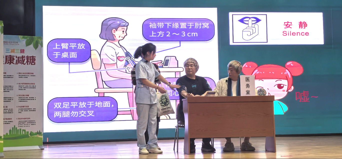 活动现场首先由区疾控中心的工作人员为大家带来了自编自导的科普短剧——“健康‘压’力秀”,通过生动形象、诙谐幽默的表演形式,向居民传授如何正确进行血压测量,做到科学施策、精准防控。